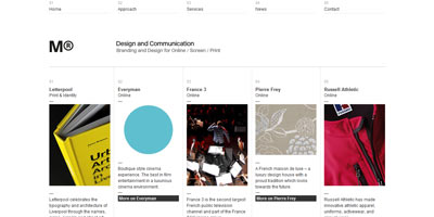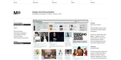 Their website is a wonderful grid-like example using lots of negative space and black / charcoal highlights.