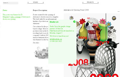 Oh luv the grid of this website – finally something that breaks away from the mold! Studio Lin has a wonderful description for his little agency: “Collaboration is king. Clarity is paramount. All things are considered.