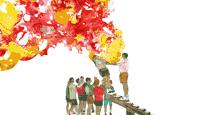 Michelle Blade populates her illustrations with little people congregating together around activities and tumultuous backgrounds.