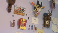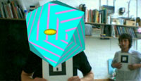 Hudson-Powell developed this piece for “Kitty’s Secret House” exhibition in Hong Kong. Using ARToolKit Augmented Reality software they tracked 3d shapes and faces onto realtime footage, letting the viewer see themselves with various abstract heads on a screen in front of them.