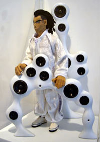 Shown one of his spectacular piece, complete with a velours outfit and a smashing looking speaker system.