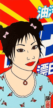 Maria Manuela is an extraordinary artist who is into portraying (japanese influenced) popicons (because there is always a person portrayed in a pop-art way) and often uses motifs symbolizing the four different seasons, and some have haiku-poems painted in calligraphy. To make a surface seem printed or associated with Japanese lacquer, she paints with vinyl on canvas with thin colour in many layers.