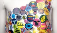 Ryan McGinness is a busy body who would make anyone envious of his multiple shows and press coverage. He does spiroglyph like paintings, installations, pop-sculptures, screen printing and even this dress, made of 1" buttons.