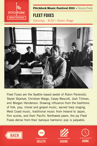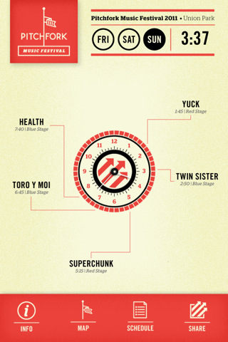 Gorgeously designed app! Powered by Diacarta, the Pitchfork Festival app will allow you to plan out your day by selecting bands from the official schedule and placing them around the clock.