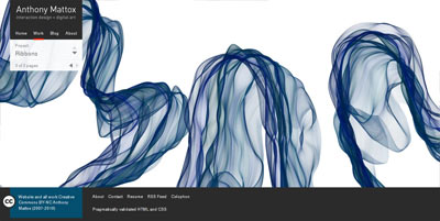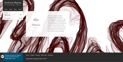 Ribbons is a script created in Processing by Anthony Mattox which generates undulating, translucent forms. As the particles are pushed around the screen by various forces, a curve is drawn along them every frame.